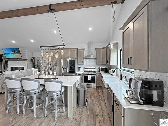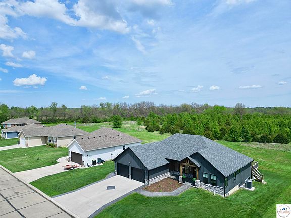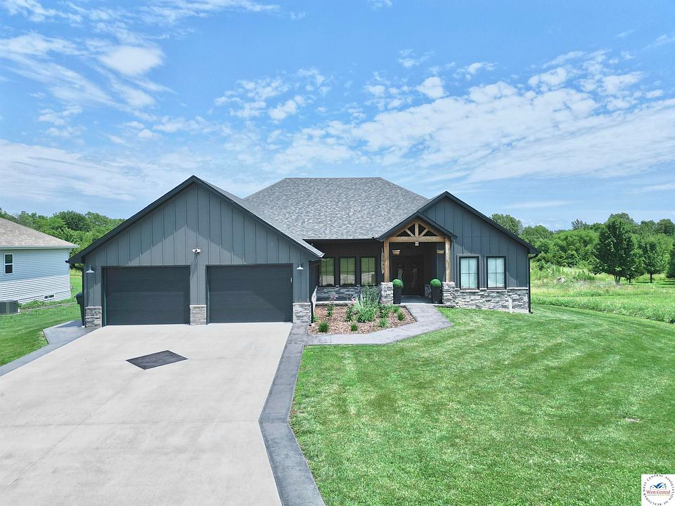 Welcome to this beautifully crafted ranch-style home that perfectly blends classic design with today’s modern comforts. The exterior showcases engineered siding, rich wooden beams, decorative concrete, and sleek black crank-out windows that create exceptional curb appeal. The statement front doors are special-ordered, making a breathtaking first impression. Inside, no detail has been overlooked. The open-concept layout offers a seamless flow through the spacious living, dining, and kitchen areas—ideal for both everyday living and entertaining. A cozy fireplace with a concrete surround and a mantle crafted from reclaimed wood adds warmth and character to the heart of the home. The kitchen is a true standout, featuring custom cabinetry, quartz countertops, a gas cooktop, and high-end appliances. This home features three generously sized bedrooms, including a spacious primary suite with a beautiful ensuite bathroom and a large walk-in closet. You'll also love the oversized laundry room- plenty of space for your washer, dryer, and extra storage. The walkout lower level provides almost 2,000 sq ft of additional space. With a partially finished kitchenette, a fully functioning storm shelter, and space for a future bedroom, living area, and storage. Call for private showing