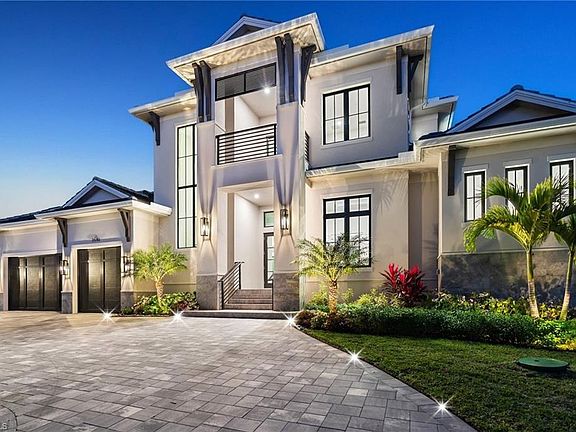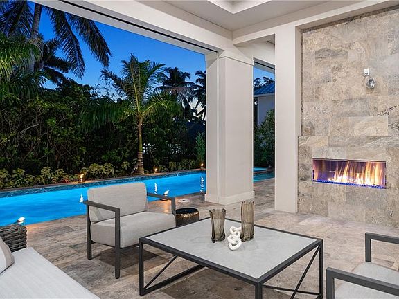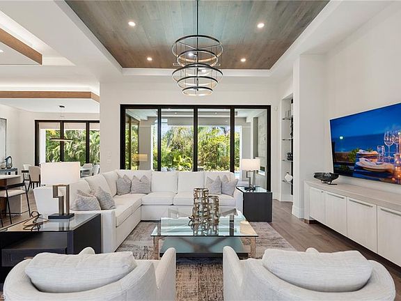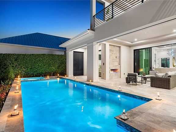 Contemporary coastal architecture with clean, modern lines is thoughtfully softened by transitional details in this stunning four-bedroom, four-and-a-half-bath Moorings residence. A striking entry through glass double doors reveals soaring ceilings, custom wood flooring, and a chic wet bar with wine storage—setting the tone for refined yet relaxed living. Built with quality and longevity in mind, the home features a full concrete, elevated structure, a galvanized steel tile roof, planned space for a whole-home generator, and high-end interior finishes throughout. The gourmet kitchen is a true showpiece, showcasing Sub-Zero refrigeration, Wolf cooking appliances, waterfall quartz countertops, and custom walnut cabinetry, all beautifully complemented by designer ceiling details. The thoughtfully designed floor plan allows for effortless entertaining, seamlessly blending indoor and outdoor living. Pocketing 8-foot sliders open to the expansive lanai with electric roll-down screens, a full summer kitchen, and a cozy outdoor fireplace—perfect for creating ambiance day or night. The owner’s retreat is a private sanctuary, offering a separate sitting area with direct lanai access, dual walk-in closets, and a spa-like bath. Family and guests will appreciate the upstairs living area, complete with a great room and wet bar, plus an oversized covered balcony ideal for gathering and relaxation. Ideally situated in the desirable north end of the Moorings, this exceptional home places you just a short golf cart ride from private Moorings beach access and the shopping and dining of Venetian Village—an ideal setting for your Naples lifestyle.
