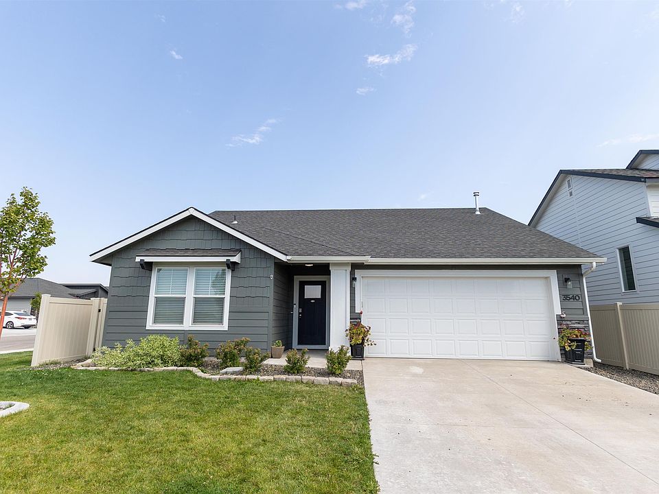 Welcome to this nearly new, single-story gem, built in 2022 and nestled in a tranquil South Meridian neighborhood. Perfect for a new family, this inviting home features 3 bedrooms and 2 bathrooms, with a thoughtfully designed open concept layout that seamlessly connects the kitchen and living room. The primary suite is a standout with its dual vanity sinks and a walk-in closet, offering a touch of luxury and convenience. With plenty of storage throughout the home, you'll have space for all your needs. The beautifully landscaped backyard provides a serene outdoor retreat, ideal for relaxing or entertaining. Located off Ten Mile Road, this home enjoys the peace of a quaint neighborhood surrounded by quiet farmland, while still being just a quick 10-minute drive to I-84, ensuring easy access to all the amenities and conveniences of the city. Save $$ on your electrical bill with built in solar.