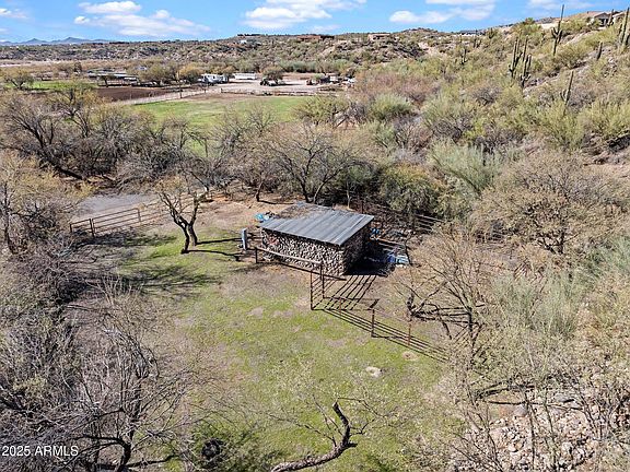 An amazing home that reflects the unique history of Wickenburg. Hand-crafted one bedroom one bath home on over 1.1 acres, with two corrals and two outbuildings. Built of river rock, concrete, and logs, the home captures the rugged charm of the old west. While history abounds, the home was built by hand in 2004. Backs to BLM land, minutes to Rancho Rio and Downtown. Trailer hookup on lower section could allow for rental during the roping season for extra income. Enjoy the trademark Wickenburg sunsets through the mature Saguaro cactus on your own hill. Dozens of palo Verdes, built in stone BBQ, and plenty of room for an addition all add up to year-round magic.