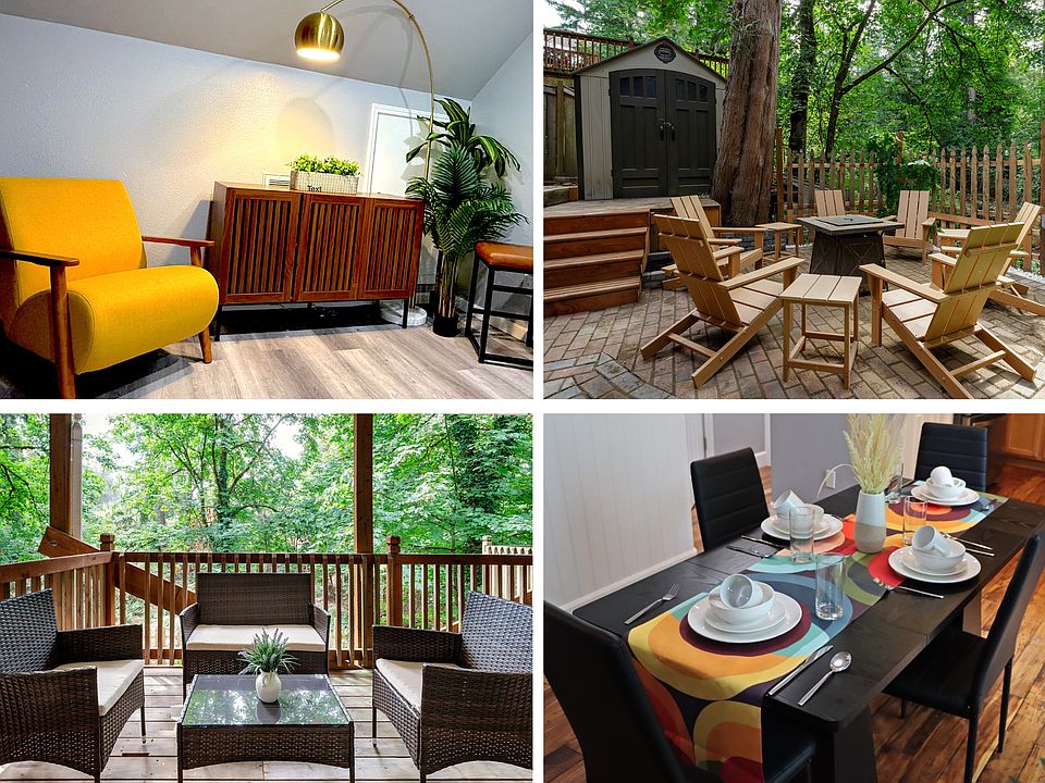 Fully stocked, gourmet kitchen upstairs and efficiency kitchen downstairs with a bbq outside on the deck. Gather in open living spaces or relax in the lush, green backyard on the decks or fire pit. Catch zzzz's on the chaise loungers on deck for a contemplative or collaborative experience with a lush green forest backyard.