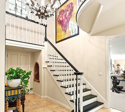 Set on nearly half an acre in a private, picturesque setting, this six-bedroom estate offers both grandeur and versatility for families seeking space, comfort, and lifestyle. Designed with a rare second-floor dual-wing layout, the residence balances expansive outdoor entertaining areas with future expansion possibilities ideal for a large or extended family.A gracious foyer with soaring ceilings and an elegant chandelier opens to a sunlit living room anchored by a full wet bar, perfect for celebrations large or small. The formal dining room sits adjacent to a chef's kitchen, featuring an oversized stone island, expansive countertops, dual workstations, a six-burner cooktop, two sets of double ovens, and two dishwashers more than ample to make both weekday dinners and gala soires a breeze. An executive den with built-in wood cabinetry offers canyon and mountain views, providing the perfect perch for work or contemplation.The grand staircase leads to a vaulted second-story foyer, flanked by a three-bedroom wing with en-suite baths, built-ins, and a shared lounge area. Dividing the space is an upstairs gym with a sauna, while the other wing accesses the theatre like media room and the primary suite. The master suite features a sitting area, the master bedroom has vaulted ceilings and an expensive view, wood-burning fireplace, balcony access through French doors, and a spa-inspired bathroom with a jetted tub, rain steam shower with seating, dual vanities, and dual closets comfort, privacy, and indulgence all in one.The grounds are equally impressive, with a resort-style pool and spa framed by natural stone, a sport court, multiple terraces for entertaining, a built-in barbecue, and lush, mature landscaping ensuring privacy. Beyond the sports court, an additional expanse of land invites future enhancements a guest house, expanded terraces, or even a second residence. This beloved estate has been the backdrop for years of memorable gatherings and cherished family life. Now it awaits its next chapter. With a fresh designer's eye, updated colors, and modern textures reflecting today's palette, this home offers an extraordinary opportunity to reimagine its grand spaces while preserving the scale, amenities, and character that make it truly remarkable.