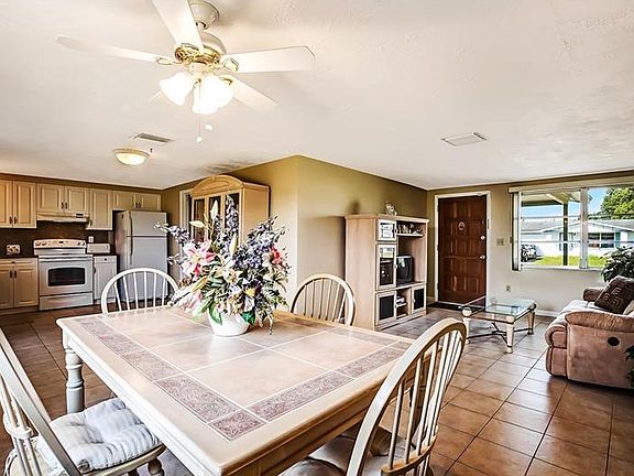 Pride & Contentment! This stand out house, exudes love & care, welcoming you home! Spacious, open layout w a great-room concept; sweeping tiled floors, lots of windows & light; an inviting space; comfortable for curling up w a book or hosting a festive gathering. Remodeled kitchen anchors the home's activity w ample cabinets, generous counter-tops, updated, efficient appliances & newer deep SS sink. Two comfortable sanctuaries to retreat to at the end of your day; soft carpet under foot, subtle fan breeze overhead + dual closet space. (1 cedar lined!) Main bathroom offers a glossy tub to soak in, tiled shower; a new toilet + basin w vanity. Enjoy your delightful Florida Room: dining alfresco, working your green thumb, take a nap w breezes wafting thru screens & jalousies, all while enjoying the surrounding landscape, sheltered from adverse weather. Extensive rear yard enhanced by mature palms, fragrant Gardenias & lush succulents. Fenced on 2 sides & bordered by well-maintained homes. Planting your garden? Playing stick-ball? Store your tools & equipment in the convenient storage shed. The attached garage is an integral multifunctional space w natural light & new impact-resistant overhead door. Housing a desirable, nicely updated 2nd bathroom w tiled shower, a valuable laundry area, attic access + loads of storage + still room for your car! Enjoy a tranquil lifestyle in quaint Aloha Gardens - no HOA or CDD fees; tucked away- yet 1 mile to US 19 for shopping, services, recreation & scenic Gulf beaches.