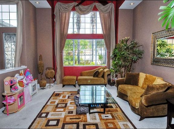 This custom cul-de-sac home offers privacy, an open floor plan, a finished five-car garage w/drive-thru roll-up doors & gated RV parking. Other features incl. netural colors, sculpted carpeting, rec.lighting, vaulted ceilings, ceiling fans & custom windows. Leaded glass entry door w/spacious liv.rm w/two story vaulted ceilings & dramatic windows. The spacious kitchen displays granite counters w/a Viking 6-burner gas cooktop, double oven, light wood cabinetry, under-cabinet lighting & a wet bar. The bkfst nook features a custom bay window & slider to patio. The fam. rm features a media niche, fire place, a tiered tray ceiling & surround sound. Yards are prof. landscaped w/lush greenery & palm trees. Full outdoor kitchen w/patio w/full width overhang, overhd heaters & surround sound & also features a spiral staircase leading to master balcony. Upstairs are three spacious secondary bedrooms & the Master Suite featuring a fire place & French doors to the view balcony overlooking view. Wow!