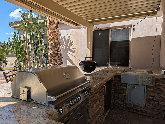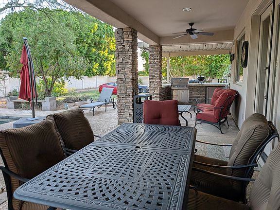 Gated community, this house is at the end of the neighborhood in a cul-de-sac. Neighborhood park, cluster mailboxes. Heated pool, theater room, bistro lights outdoor. 4 bedrooms + office (no closet). We are moving out of the country for a few years, furnishings can be all or none. Redid appliances in 2022, new countertops throughout house. Added a pot filler and gas stovetop. Small doggy door, alarm system hooked up, and security cameras (video doorbell also) via Arlo. Navel oranges and white figs on property. Redid the master bathroom in marble. New carpet in 2022.