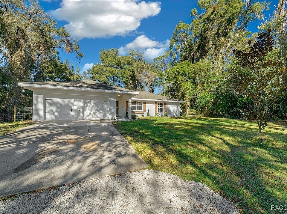 Discover the perfect blend of comfort and style in this inviting 3-bedroom, 2-bathroom Inverness home! Nestled on nearly half an acre, the property offers a serene setting with a spacious backyard and a convenient storage shed. Step inside to find stunning quartz countertops, a bar for additional seating, and an eat-in kitchen dining area, creating the perfect space for gatherings. The master suite is a true retreat, boasting a walk-in closet with custom barn doors and a luxurious master bath featuring a jetted tub, a brand-new vanity, and a new medicine cabinet. The exterior has been recently pressure washed and freshly painted, ensuring this home is truly move-in ready. Don't miss this opportunity to make this beautifully updated property your New Haven!