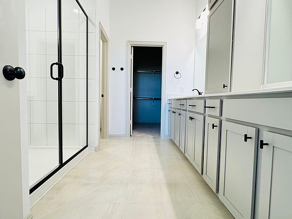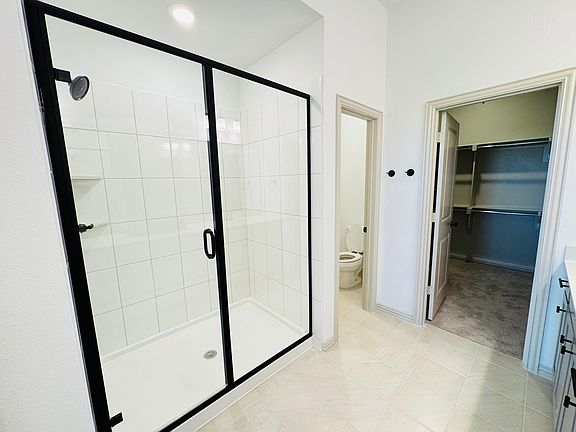 First-floor primary ensuite featuring vaulted ceilings, oversized vanity, large shower, and walk-in closet.