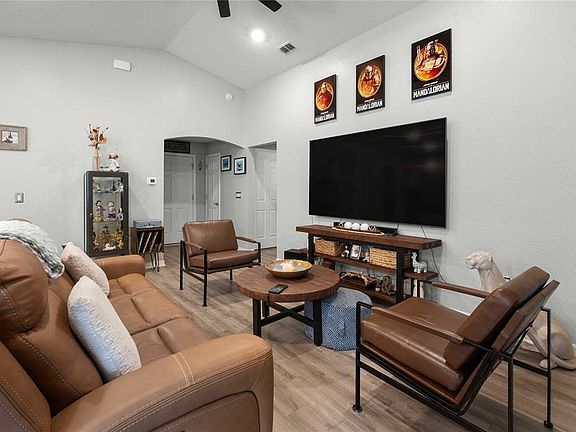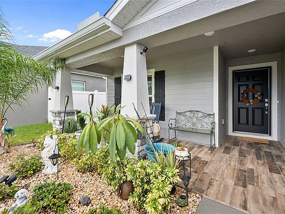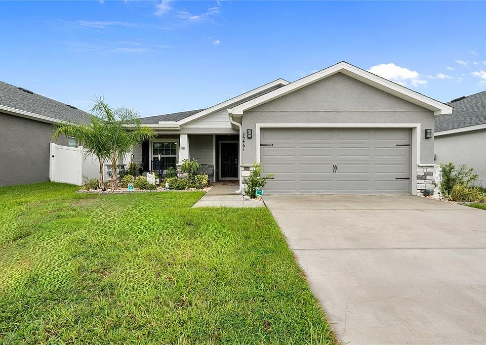 NEW PRICE! Step into modern comfort with this stunning 2023 Highland Homes build featuring 3 bedrooms and 2 bathrooms, beautifully designed with numerous upgrades throughout. The open-concept floor plan boasts soaring ceilings, including a dramatic 12-foot peak in the living room, creating an airy and inviting atmosphere. The chef’s kitchen is a true centerpiece with an oversized cooking island, deep double sink, wood cabinetry, stainless steel appliances, and durable Korean countertops. Custom lighting enhances the dining and kitchen areas, making it ideal for entertaining. Luxury vinyl flooring flows seamlessly through the main living areas and the spacious primary suite, which offers a ceiling fan, huge 8x10 walk-in closet, double granite vanity, oversized linen closet, and a spa-like step-in shower with custom tile. Bedrooms two and three feature built-in closets, carpet, and ceiling fans, while the guest bath showcases a granite vanity, tile backsplash, high toilet, and tub/shower combination. Enjoy Florida living on the screened lanai, complete with ceiling fan and peaceful views of the fenced backyard and the serene lake—no rear neighbors for added privacy. Additional highlights include double-pane windows, drywall construction with rounded corners, a water softener and water treatment system (2023), granite and tile finishes, and thoughtful touches throughout—too many to list. As part of the HOA, residents enjoy a large, heated pool, two dog parks, a youth playground with full amenities, and a scenic hiking trail with built-in fitness stations—adding even more to love about this vibrant community. This move-in-ready home blends quality construction, modern upgrades, and a beautiful setting, making it a truly rare find.
