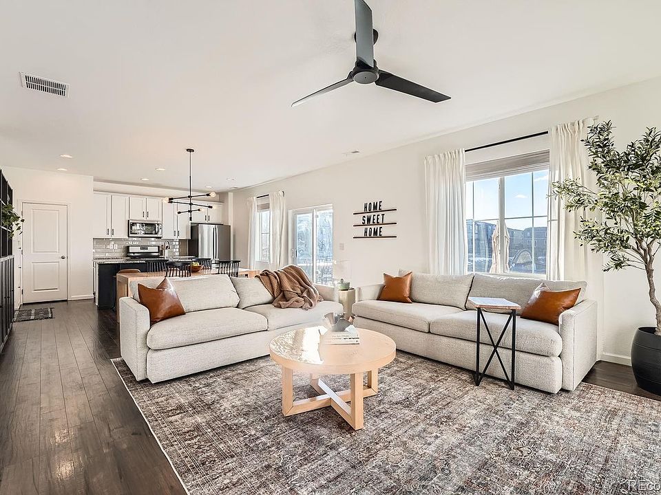 Welcome to this beautifully upgraded 4-bedroom, 3.5-bath home located in the heart of The Meadows. Step inside to discover an open floor plan on the main level, where large windows frame stunning mountain views, creating a bright and inviting space perfect for both everyday living and entertaining. The upper level features four spacious bedrooms and a convenient laundry room, offering an ideal layout for comfortable living. The finished basement expands your living space with a media room, a gym, and an additional bathroom, providing plenty of storage and versatile options for use. Outside, the professionally landscaped backyard is your private oasis, perfect for relaxation and hosting gatherings. Positioned near the end of a cul-de-sac, this home enjoys breathtaking views of the Rocky Mountains and city lights, all while backing onto expansive open space. Enjoy all that The Meadows has to offer, with easy access to biking and hiking trails, open spaces, parks, a community pool, and exceptional dining and shopping options. This home seamlessly blends modern upgrades with its natural, scenic surroundings, offering a truly exceptional living experience.
