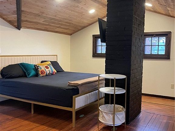 Upstairs, you'll find a private primary suite offering a serene retreat, complete with its own bedroom, full bath with walk-in shower, and a warm natural wood ceiling that enhances the home's architectural charm.