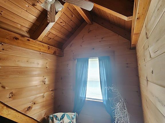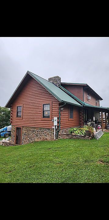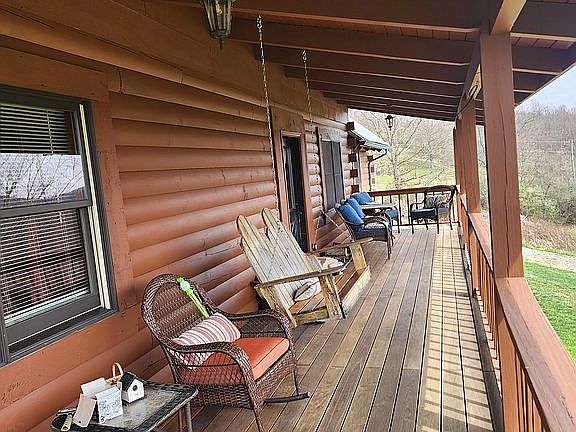 You'll love this spacious custom built log home on almost 13 acres with an amazing view. The home offers a private setting located on a county-maintained gravel drive. Outside, you will find metal roofing, long life exterior stain, and updated porch and deck flooring along with covered 8' x 40' upper and lower front porches, a covered back porch, and an open wrap-around deck. Inside, this beautiful home offers 2,348 SqFt of living space including 4 bedrooms, 2 1/2 baths, great room with fireplace, hickory cabinets with solid surface countertops, solid wood and laminate flooring with Tarkett Permastone flooring in baths and laundry room. Master bedroom with bath is located on main floor with 3 additional bedrooms and bath upstairs. Downstairs, you will find a full basement with finished office area, canning area, and cellar. The home has an updated electric heat pump with central AC along with a wood burning furnace. This is an authentic, custom log home on a gorgeous property priced below appraisal!