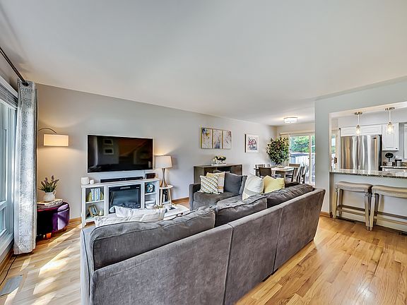 Rich hardwood floorsSleek quartz countertopsLarge fenced-in patioIn-unit laundryOpen-concept main floorStunning white kitchenHandy breakfast bar
