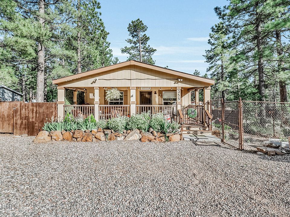 Discover this beautiful home nestled in a tranquil cul-de-sac within the picturesque Munds Park community. This home features a great room, with vaulted ceilings and a cozy pellet stove fireplace for you to enjoy. The open kitchen has granite countertops, beautiful cabinets, an island and stainless steel appliances. The 3 generous sized bedrooms each have large closets with plenty of storage. Spend summer nights relaxing are your large deck. And if you have pets, the yard is fully fenced and includes a storage shed and ample parking space for your toys and RVs. A perfect as a retreat from the valley heat, Munds Park is a charming northern Arizona community offering a variety of activities, including hiking trails, off-road riding, a country club, and a lake for fishing and kayaking.