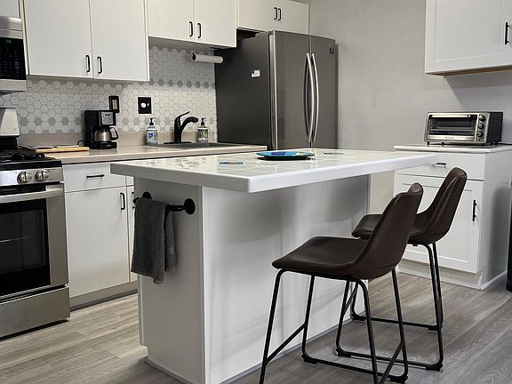 Partially furnished: Murphy bed with sumptuously comfy full-size mattress, brand new cozy couch with ottoman, fully stocked kitchen, center island with two stools, large screen TV, desk and rolling orthopedic office chair, and more!