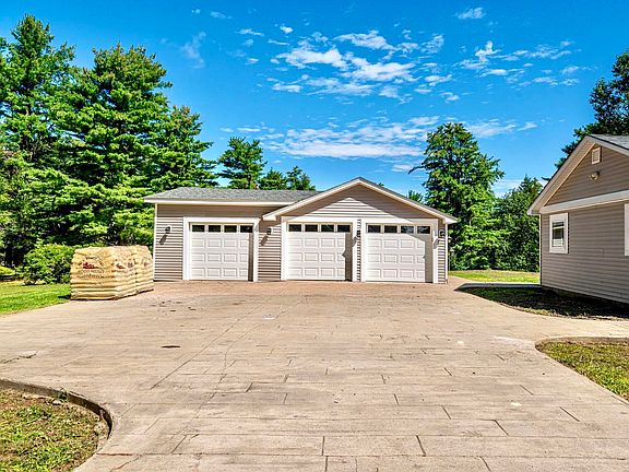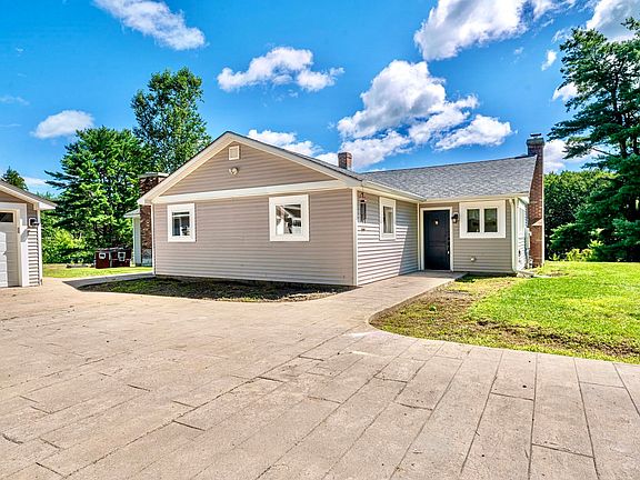 STUNNING FULLY RENOVATED RINDGE RANCH, ONE LEVEL LIVING AT IT'S FINEST! Located on 2.37 acres of lush greenery, this beautiful home has it all! Pull up the beautiful stamped driveway and choose which spot to pull into in the large 3-car garage. As you enter you are greeted with a gorgeous slate tile mudroom that leads seamlessly into the massive open concept layout with beautiful hardwood floors throughout, vaulted ceilings with exposed beams, large windows for maximum natural light and a lovely fireplace with a pellet stove. Overlook the incredible backyard with blueberry bushes while enjoying a meal at your eat-in dining area or at the large breakfast bar. Perfect for the budding chef, the kitchen is equipped with stainless steel appliances, concrete countertops, beautiful cabinets, a tile backsplash and large pantry. There are three large bedrooms, one being a primary with a gorgeous wood fireplace and a huge walk-in closet, with a full bathroom directly next to it. The additional bedrooms are ideal for an office, a gym, a study or family room, with a full bathroom adjacent to both. Head outside the secondary mudroom onto the covered patio area between the garage and outbuilding for outdoor dining and grilling. The extremely convenient outbuilding is a great place for additional storage, but also potential to be finished for even more living space. Also conveniently located near hiking & snowmobile trails! DON'T MISS OUT ON THIS GEM!
