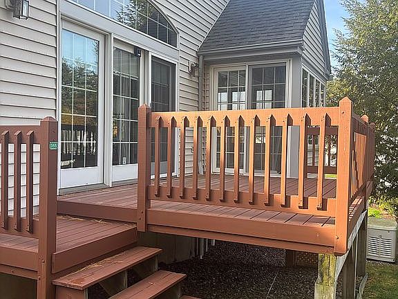 At the Elms, a beautiful and bright ranch style condo in a 55 and over adult community offering one floor living and expansive open floor plan. Living room, kitchen and dining area all open with gorgeous hardwood flooring, gas fireplace with custom shelving and high ceilings in living room. Granite kitchen island with additional seating. Large primary bedroom located off of living room with new wall to wall carpet, walk-in closet, and full bathroom with standup shower and linen closet. There is also an additional guest bedroom, and full bathroom. Oversized windows throughout this home offers natural lighting. This home also has a 3 season porch and whole house generator, pantry, laundry room with sink, counter and cabinets. 2 car attached garage and cedar deck.