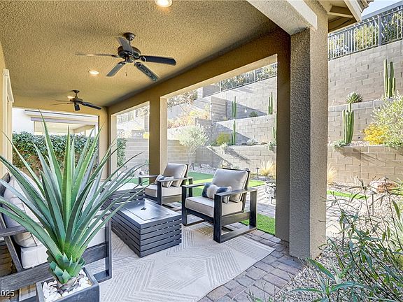 Highly sought-after gated Summerlin beauty. This stunning home boasts luxurious upgrades including new wide plank LVP flooring, 5" baseboards & fresh designer paint. Open-concept kitchen has premium finishes including designer cabinets, upscale fixtures, SS Appliances including Dbl Ovens, a Quartzite Waterfall Island w/ seating perfect for dining or entertaining. Outside, a covered patio w/ fan & tiered backyard is beautifully landscaped to enjoy all day outdoor living. A desirable downstairs bedroom & bath provides guest privacy or Next Gen option. Upstairs flexible large loft w/ closet & convenient laundry room. The luxurious primary suite offers a spa-like bathroom along with ample closet space. This home is the epitome of style, comfort, and convenience along with zoning to top-rated schools. Minutes to DT Summerlin premier shopping, dining & Las Vegas’ world class entertainment. Or get your hike on at breathtaking Red Rock Canyon. Don’t miss out on this incredible opportunity.
