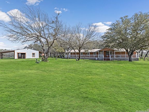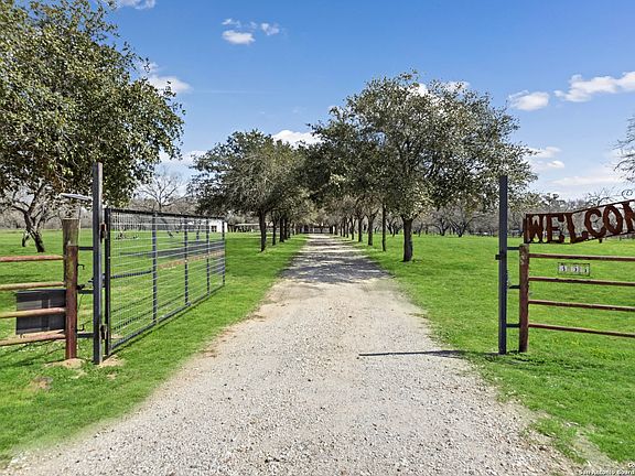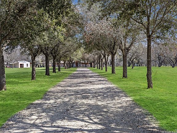 Welcome to your peaceful retreat nestled among the sprawling landscape of over 5 acres, a beautiful ranch-style home with abundant charm and modern comforts. This 5-bedroom, 2-full bath haven is shaded by oak trees, mesquite, and flourishing fruit trees including blackberry trees, creating a serene environment. Inside, discover the elegance of hardwood floors throughout, granite kitchen countertops and stainless steel appliances. Also features a new roof and new central HVAC unit ensuring year-round comfort. Enjoy the convenience of two separate living areas, each equipped with its own AC unit, and cozy up by the fireplace on cooler evenings. Outside, experience the joys of country living with a covered carport, a barn/storage with additional covered parking, and a refreshing swimming pool perfect for beating the Texas heat. Whether you're seeking tranquility or space to entertain, this property offers the best of both worlds. Located 30 minutes from San Antonio, the Toyota plant and Texas A&M university. This is the property you waited for to enjoy country living and don't forget to bring your horse.