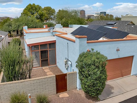 Downtown! Award winning Amory Park del Sol. Owned solar power, on demand tankless water heater to augment solar water collector, masonry construction for thermal mass, 3 bdrm., 2 bath, great split plan, universal accessibility, roll-in shower, wide hallways, step free entrance. Custom clerestory south facing windows in living room to provide extra light and air circulation. Whole house water filtration system. Generous side yard with raised beds for veggies and herbs. Screened in rear porch. Two blocks to the trolley to UofA campus, restaurants, museums. Well lighted HOA maintained sidewalks. Open Saturday