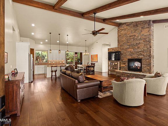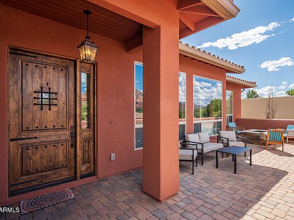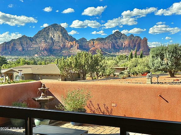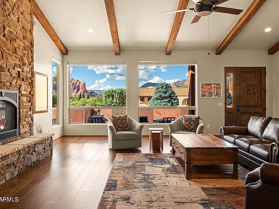 Saddlerock Circle Stunner! One of the best-placed Saddlerock Homes, this like-new 2020 build captures Sedona living at its finest. Expansive picture windows frame jaw-dropping vistas of Thunder Mountain, Chimney Rock, Coffee Pot, and more. Watch light dance across the red rocks, transforming your view into nature's living artwork all day long. Featuring 3BD | 2BA | 2,178 SF on a .32-acre lot, the open plan boasts soaring ceilings, tile + wood floors, and a two-way fireplace connecting the living room and primary suite. Outdoors, a Zen meditation garden and rooftop deck showcase iconic panoramas—just steps from Whole Foods, art galleries, restaurants, and trails. All one level with no carpet or steps, this move-in ready retreat has no HOA—perfect as a primary home, investment, or STR. As you approach the walled front courtyard, the soothing sound of a water feature, paired with pavers and desert landscaping, sets the stage for unforgettable red rock views. Inside, soaring ceilings with warm wood beams and a dramatic two-way fireplace anchor the spacious living room. A wall of windows offers front-row seats to Sedona's ever-changing vistas. The great room is the heart of the homeperfect for entertaining, cozy evenings by the fire, or simply gazing at the shifting light on the rocks. Luxury vinyl plank flooring and high ceilings add to the sleek, contemporary feel.