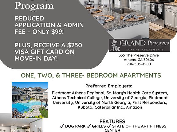 Grand Preserve is a pet-friendly, newly built community offering 1, 2 and 3-bedroom apartment homes surrounded pristine landscaping with convenient access to Atlanta Highway and the GA-10 Loop for your daily commute.