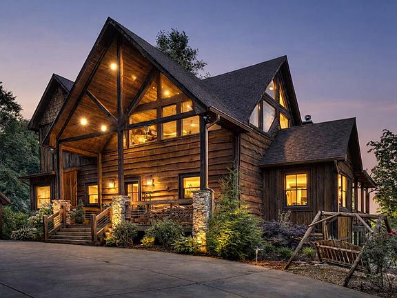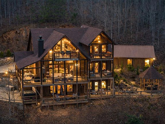 Luxurious mountaintop chalet offering privacy, long-range mountain views, plus Toccoa River access-offered fully turn-key! Privately positioned within a cul-de-sac at the highest point within South Toccoa Estates – a highly sought-after gated community, this refined mountain retreat offers seclusion and convenience like no other. Professionally designed with elevated furnishings and finishes throughout, the open-concept floor plan features expansive great rooms with floor-to-ceiling windows and three private balconies all framing panoramic views of the Blue Ridge Mountains! Accommodating up to twelve guests with the conversion of the detached garage to a fourth bedroom / bunkhouse, the layout inside the main residence includes three ensuite bedrooms with walk-in closets and each with private deck access. The main-level primary suite features a king bed, fireplace, convenient laundry, and a well-appointed bath with jetted tub and walk-in shower. Multiple entertainment spaces highlight this mountain escape making it perfect for large family gatherings. Outdoor living is equally impressive, highlighted by the sky bridge overlooking the Toccoa River and sweeping mountain vistas. Additional features include an oversized hot tub, a total of four fireplaces, and multiple seating and dining areas plus full bar ideal for hosting family and friends. Ideally located between the historic downtowns of Blue Ridge and McCaysville, this mountaintop escape offers paved road access, high-speed internet, and a gated concrete driveway, with deeded access to the river pavilion and the trophy trout waters of the Toccoa River. Well-suited for full-time living, a premiere luxury rental investment, or a mountain-and-river weekend retreat.
