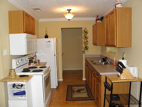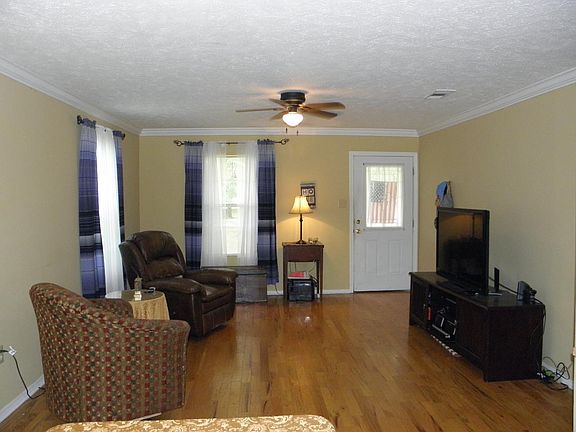 This is a well-maintained custom built 2 bedroom 2 bath home with office. Very roomy home with 1144+- square feet, vinyl exterior and 2+- acre yard. It is located on a paved county road. Full front porch to open living and dining plus kitchen and utility room. Permanent and detached cabinets remain with kitchen and utility room. Fridge remains with appliances. Sliding glass doors from dining to covered 12x24porch. Porch overlooks yard and woods. All floors except baths are hardwood. Crown molding in living, dining, kitchen, hall and master. Master bedroom has bath and walk-in closet. Guest bedroom has double door closet. You'll enjoy the office/computer room. Hall bath with linen cabinet. House plans for this custom built home were originally a 3 bedroom 2 bath home but sellers decided to have an office/computer room instead of a third bedroom. 10x16 metal storage building. 1 yr. home warranty. Air has just been serviced and cleaned.