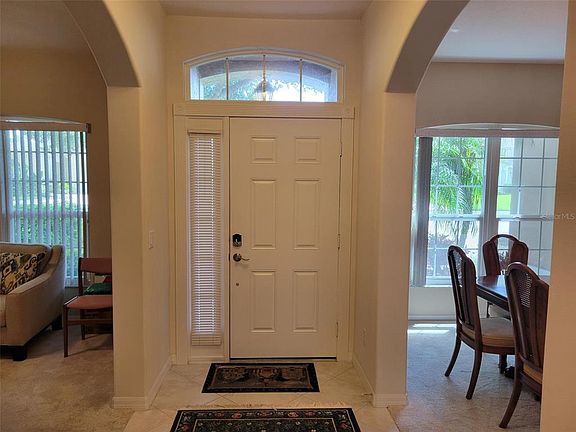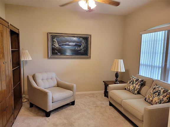 Magnificent home in highly sought-after 55+ Kings Ridge. Enjoy the awesome sunsets on the West facing Lanai that overlooks the 14th fairway of the golf course and pond with a beautiful water fountain. This lovely St Clair model boasts three spacious bedrooms and two baths with 1922 square feet of living space. Entering the home at the foyer features the Dining Room on the left and Family Room on the right. The large Living Room is off the gourmet kitchen with sliding door access to the oversized 29 x 18 screened covered lanai. Home includes a 2 car garage with door opener, utility sink and water softener. Interior laundry Room. All appliances are included in the sale, except for the Washer & Dryer. Seller is including the Dining Room Table, Chairs and Buffet if desired by the Buyers. Enjoy the safety of a guard gated community and beauty of tree lined streets and amazing community amenities including a multi-million-dollar clubhouse. Live the Royal lifestyle with two 18-hole golf courses, three heated pools, two fitness centers, spas, tennis & pickle ball courts, billiards, shuffleboard, shows, Bingo, Dancing, cards, crafts, movie & food truck nights and join any one of the many clubs galore. HOA dues include lawn maintenance & irrigation, exterior painting, landline phone, basic cable and internet and all community amenities. Close to Highway 27 and 50, Florida Turnpike with easy access to downtown Orlando within 30 minutes & twenty-two miles to Disney. Conveniently located outside the community: golf cart accessible Publix, University of Florida urgent care center, doctors, dentists, Walgreen’s pharmacy, Quest and close to Costco, Kohls, Walmart, BJs and numerous restaurants within five miles. At least one buyer must be at least 55 years old or older for HOA approval. Age of Items: New Roof - Nov 2024; New Complete Lennox HVAC Unit - Oct 2023; New Water Heater - Oct 2023; Exterior Paint - Oct 2022; Energy Efficient Pella Windows & Sliding Glass Doors - 2017; Upgraded Flooring - 2017. Call for a private tour of this fantastic home. The oak tree in the front yard was recently struck by lightning. It will be removed and the area restored at the seller's expense.