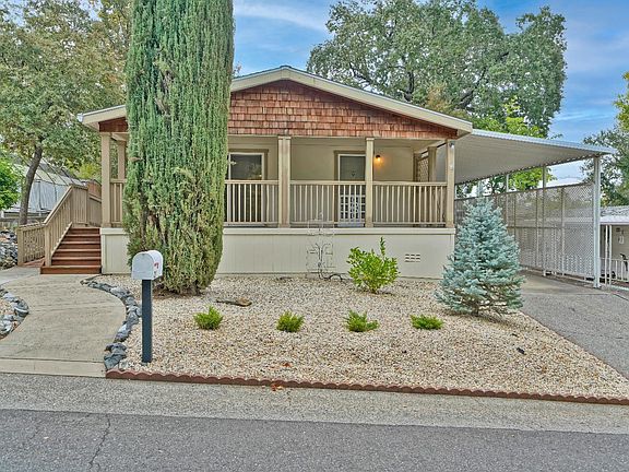 Bright and inviting 2 bedroom, 2 bath home in Diamond Springs Mobile Home Park, a welcoming 55+ community. The open floorplan features a spacious living/dining combo with vaulted ceilings and a sliding glass door leading to the covered front porchperfect for relaxing. The kitchen boasts plenty of cabinets and stainless steel appliances, while the oversized laundry room offers additional storage and outside access to the carport. The private primary suite is tucked at the back of the home with its own bathroom featuring a walk-in shower and storage. The secondary bedroom with double-door entry is versatile, and the second bath includes a shower-over-tub with grab bars. Enjoy the low-maintenance yard, long driveway with carport, storage shed, and covered porch complete with ceiling fan and ramp for easy access. Priced to sell, this move-in ready home is a great opportunity to enjoy comfortable, low-maintenance living in a friendly 55+ neighborhood.