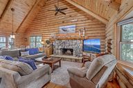 Stone fireplaceCustom-built log cabinGunite poolUnfinished upstairsSix-person hot tubPrivate fishing pierPremium appliances