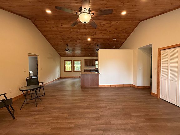 Welcome to your brand new home! Brimming with possibilities, this home is ready for anything. Entering into the open concept living area, you’ll find cathedral natural wood ceilings. To the left of the living area is the first bedroom, which includes a large closet. Further into the open concept area, there is a dining area and oversized Amish-built kitchen with room for a fridge, dishwasher, and gas stove. There is a double-sided stainless steel sink, and the immaculate handcrafted cabinetry is complete with slow-close technology. Leaving the kitchen, to the right is a hallway leading to the first large bathroom that has extra built-in storage and a one-piece shower and tub combination. Down the hall, there is an oversized laundry area that includes hookups for an electric washer and dryer. This is also where the second exterior door is located, accessing the gravel driveway. Across the hall from the laundry, there is another storage closet that opens into the well-designed utility room that includes the 200AMP panel box, a well compression tank for the 145’ drilled well, and the boiler/water heater combination that is used for the radiant in-floor heating system and on-demand hot water. On the other side of the home, you’ll find the other two bedrooms, each featuring its own closet, while the primary bedroom has two closets and has an ensuite bathroom also featuring a one-piece shower and tub combination. The home is floored with luxury vinyl plank flooring and has new energy-efficient windows and doors! Outside, the home is sided with luxury vinyl siding and has a metal roof. The home is secluded and has a long gravel driveway. The 10.6 acres have been well-maintained and feature many mowable wooded trails perfect for the next adventure! Call your agent to make this beautiful home yours!