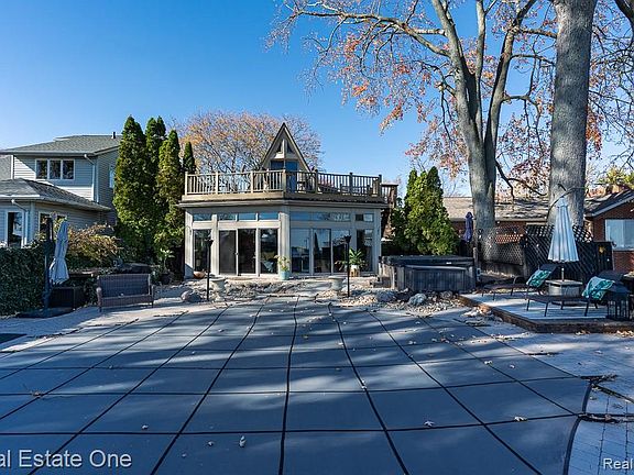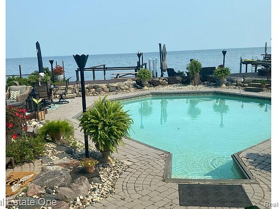 DON’T MAKE A MOVE WITHOUT stepping through the gate — you’ll instantly know you’re somewhere truly special. Imagine coming home after a long day to your own private chalet right on beautiful Lake St. Clair. This charming A-frame waterfront home blends character, luxury, and upscale cottage vibe living. The exterior features multiple stone fountains, paver patio, brick firepit, dock, boat hoist, hot tub, in-ground heated pool, and whimsical gardens — all set against breathtaking Lake St. Clair views. Step inside and be welcomed by soaring cathedral ceilings, a two-story natural stone fireplace, leaded glass window, and an abundance of natural light. The gourmet kitchen will delight any chef, featuring ceramic floors, recessed lighting, large tile counters, custom cabinetry, and high-end stainless steel appliances — including Amana refrigerator, Bosch dishwasher, Jenn-Air microwave, and a nearly new Frigidaire Gallery stove. The dining area is surrounded by windows showcasing serene garden views. The main level offers two bedrooms, a full ceramic bath with a glass shower, elegant vanity, and recessed lighting. Upstairs, the primary suite is a private retreat complete with wood floors, vaulted ceilings, and a luxurious primary bath featuring a jetted tub, oversized glass shower, and exquisite tilework. Additional highlights include a spa room, laundry area with electric panel, newer roof, and thoughtful details throughout — from ceiling fans and recessed lighting to extensive custom tile and craftsmanship. With 3 bedrooms, 2 full baths, and 2,121 sq ft of beautifully designed light filled living space, this home offers the perfect blend of relaxation and sophistication — ideal for everyday living or entertaining on the water. Minutes by car or boat to some great lakeside restaurants. Come experience the magic of L'anse Creuse Bay on Lake St. Clair where you could enjoy lakefront living — your private lakeside escape awaits!