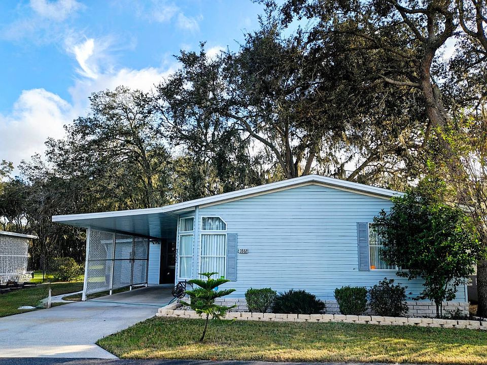 This spacious 3 bdrm, 2 bath PALM HARBOR is completely furnished and in move in condition. The open kitchen is equipped with stainless appliances and a pass thru countertop into the dining area. The breakfast area overlooks the 14th fairway and is lined with mature oak trees. The master bedroom will accommodate a king size bedroom suite and has 2 closets and a large bathroom with a walk-in shower. The driveway can park 2 vehicles, and the attached shed is oversized to accommodate a golf cart and plenty of storage. The golf course lot rent is $1031 a month for the current year (2025), and the roof is new! Southport Springs Golf and Country Club (SPS) is a PREMIER 55+ community with superb amenities including a beautiful Club House with ballroom/stage for banquets and dances, fitness center, card room, a restaurant/tavern with a fully stocked bar. Activities include golf at the 18-hole golf course, tennis, pickleball, horseshoes, bocce, shuffleboard, power walking, bingo, potlucks, pool tables, and line dancing. You might prefer a dip in the heated swimming pool or relax in the two hot tubs. SPS has over 500 homes and is pet-friendly with a place to park your RV or trailer. SPS is less than two miles from shopping, medical facilities, dining, and houses of worship. Only 45 minutes from downtown Tampa and the Tampa International Airport. There are many nearby attractions like Busch Gardens, many beaches along the Gulf of Mexico. Go see the Tampa Bay Buccaneers, TB Lightning, TB Rays, Orlando Magic, as well as spring training with the New York Yankees. Family fun is also readily available. The excitement of Orlando's theme parks includes Walt Disney World, Epcot Center, Universal Studios, and SeaWorld which are just 60 miles away. There is truly something for everyone in this friendly and wonderfully maintained Florida community.