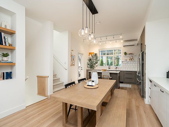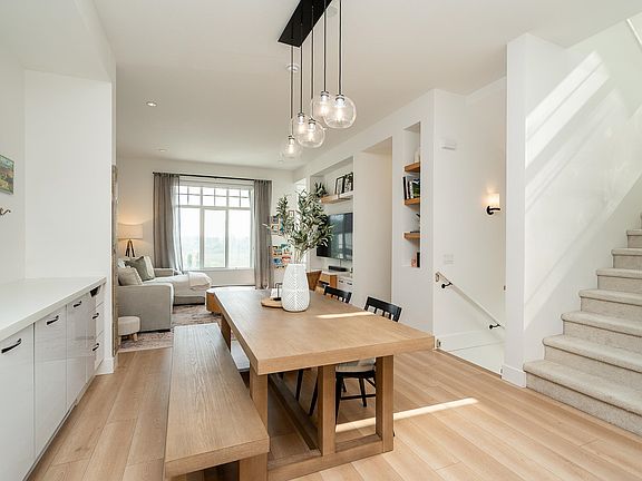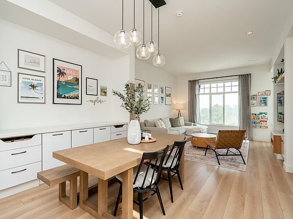 STUNNING Corner home at Victoria by Mosaic! This AIR-CONDITIONED 4 bed + den, 4 bath home offers 1,803 sq ft of modern and functional living. Extensive custom millwork w/display shelving and integrated storage throughout creates a cohesive design. The main features an open-concept plan w/a spacious kitchen offering endless cabinetry, large island, and direct access to a walk-out backyard with extended patio. Dining area flows into a generous living room, complemented by a private den ideal for a home office. Expansive SE facing views! Up are 3 beds, primary w/custom closets, while lower level offers a flexible rec room or 4th bed. Complete w/a finished double side-by-side garage plus 2 additional driveway spots. Steps to trails, parks and a short drive to schools, shopping + amenities.