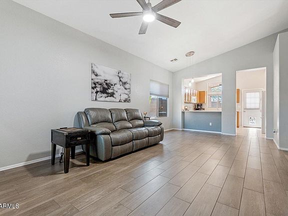 Nestled at the end of a quiet cul de sac, this beautifully maintained Anthem home offers comfort, privacy, and thoughtful updates throughout. Inside, vaulted ceilings and wood look tile floors create a bright, welcoming feel. The freshly painted interior and new ceiling fans add a modern touch, while the kitchen, tucked just off the main living space, provides plenty of room for cooking and casual dining. The spacious primary suite features a walk in closet and private bath. Step outside to a peaceful backyard with southern exposure, perfect for relaxing or enjoying the sunshine. With a new AC installed in 2022 and a new mini split added in 2024, this 3 bedroom 2 bath home is move in ready. Located near Anthem's community center with pools, fitness facilities, pickleball, tennis, and more, this home also offers easy access to shopping, dining, and nearby schools within walking distance. Enjoy the vibrant community lifestyle with weekend farmers markets, local events, and scenic walking paths just outside your door.