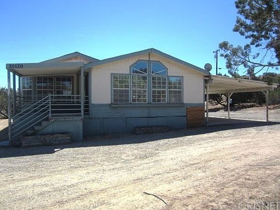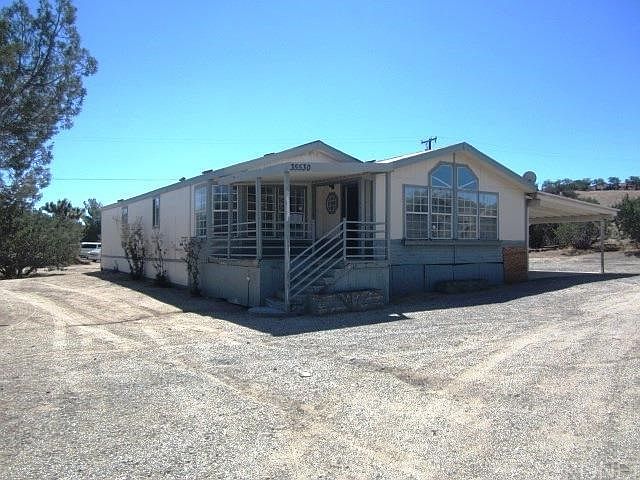 This manufactured home on a permanent foundation enjoys a quiet spot nestled on more than 5 acres in the Palmdale foothills. A nice front porch opens to the spacious living room with sunny windows and an impressive stone fireplace to warm the chilly evenings. The formal dining space features a built-in china/display cabinet; arched openings lead to the kitchen with solid surface counters, built-in appliances and an eating nook with a wall of windows to enjoy the view. Double doors open to a sizable bonus room that could serve a variety of uses. Down the hallway, the master bedroom includes two walk-in closets and a private bath with dual sinks, garden tub and separate shower. A second bedroom, full bathroom and convenient laundry room complete the home. Outside, a carport provides for parking and the raised deck is a perfect spot to relax and enjoy the view.