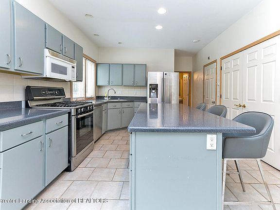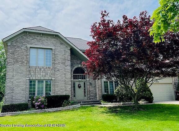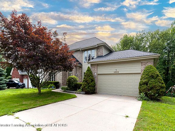 This gorgeous home in Spring Lake subdivision in Okemos offers over 3,600 square feet of living space, designed for both comfort and entertainment. It provides ample space for relaxation and privacy. The house features a two-story foyer with tiled flooring, leading to a well-lit interior throughout the day. The kitchen is equipped with Corian counters and an island with bar seating, along with an adjacent breakfast area. A French door separates the formal dining room from the breakfast area. A sliding door from the breakfast room leads to a large, newly painted deck. The backyard can be accessed either from the deck stairs or the walkout basement's sliding door. The two-story family room includes a gas fireplace and hardwood floors, suitable for large gatherings. There is also a formal living room intended for hosting guests. A spacious office with built-in bookcases enhances the convenience of working from home. The first floor also includes a laundry room. On the second floor, there is a primary suite and two additional large bedrooms, each capable of accommodating king-sized beds. The primary suite features double doors, a jetted tub, tile surround shower, double sink counter, and a full-length walk-in closet. The upstairs walkway overlooks the foyer and family room. The walkout lower level has a large recreation room with in-floor heating, a wet bar, a sink, a spacious bedroom, and a full bathroom. There is also a substantial unfinished area for storage. The walkout sliding door opens to a concrete and brick patio leading to a nature area. The exterior includes a brick front and wood siding. Spring Lake subdivision provides amenities such as tennis courts, basketball courts, sidewalks, walking trails, lakes, and more. It is close to highways, MSU, Meridian Mall, shopping facilities, and within walking distance to Hiawatha Elementary School. Updates: The roof was replaced in 2013, and the furnace, floor heating boiler and water heater were replaced in 2015. The deck was painted in June 2025. Current taxes are non-homestead. Occupancy is available at closing.