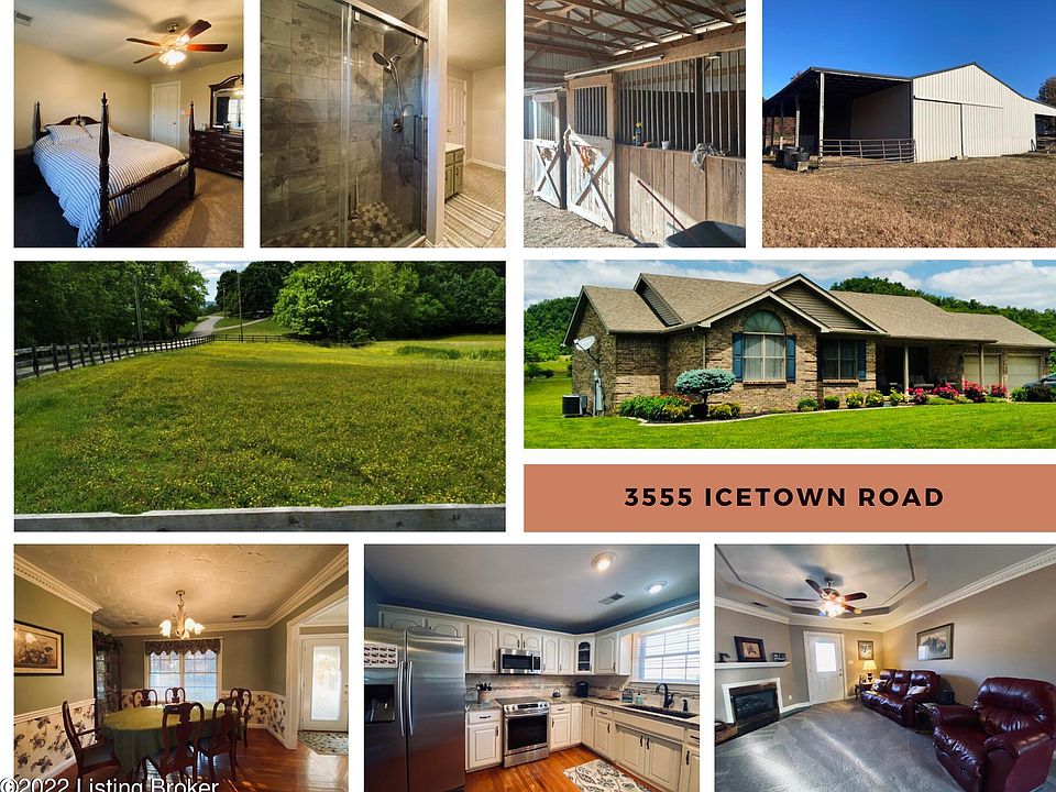 8.62 ACRE MINI FARM! Bring your animals & let's go take a look at this great three bedroom two bath brick ranch style home with attached garage on 8.62 beautiful scenic acres with small pond & four stall barn with lean to, electric & water located in the small-town community of Boston, Ky. Home offers a hardwood foyer, Living Room with crown molding & propane insert fireplace. Lovely Kitchen features cream cabinetry, granite countertops, tile backsplash & full complement of stainless appliances including range/oven, refrigerator, dishwasher & microwave. Separate Dining Room offers a perfect place for large gatherings. Tiled Laundry Room is another great feature. Carpeted Primary suite provides a nice walk in closet. Tiled Primary Bathroom with walk in tiled shower. Two additional carpeted bedrooms & tiled hall bath complete the interior of this great home. Venture outdoors to enjoy scenic views of the lovely acreage from the rear deck & patio. Kick back & relax on the covered front porch as you enjoy your morning coffee or afternoon tea. Property offers nice landscaping with decorative curbing, small pond, outbuilding & board fencing. Four stall barn with lean to with water & electric is perfect for animals. Come home to the country. Come home to 3555 Icetown Road, the perfect place to call home! Conveniently located 5 miles to New Haven, 8 miles to the BG Parkway, 15 minutes to Bardstown & 27 minutes to Elizabethtown. Call today & let's take a look.