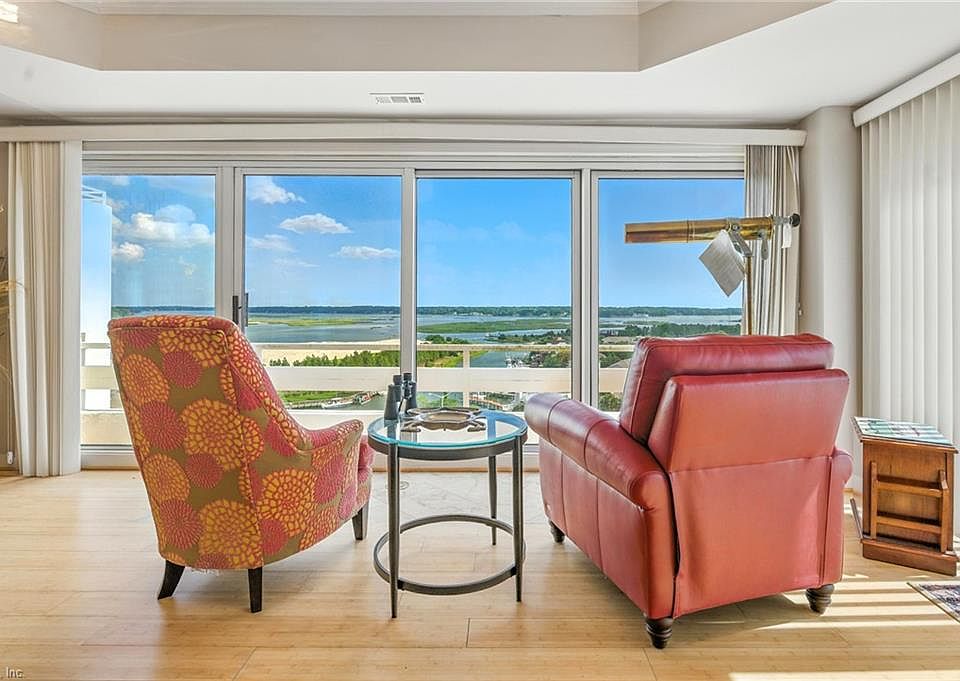 Move-in ready, penthouse condo offering luxury and sweeping views of the Chesapeake Bay and Lynnhaven River. Impeccably maintained, this spacious home is filled with natural light from floor-to-ceiling windows and sliding glass doors, blending indoor elegance with breathtaking vistas. Enjoy water views from the living, kitchen, and dining areas, or relax on the wraparound balcony. Upstairs, generous bedrooms include a stunning primary suite with floor-to-ceiling windows, an electric fireplace, private balcony, spa shower, and soaking tub. Cedar closets grace all bedrooms, and the second bedroom features Shore Drive’s largest grand balcony. Residents enjoy a grand lobby, pool, fitness center, sauna, private beach access, social events, and three guest suites for visiting family and friends. Coastal living at its finest awaits!