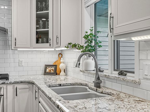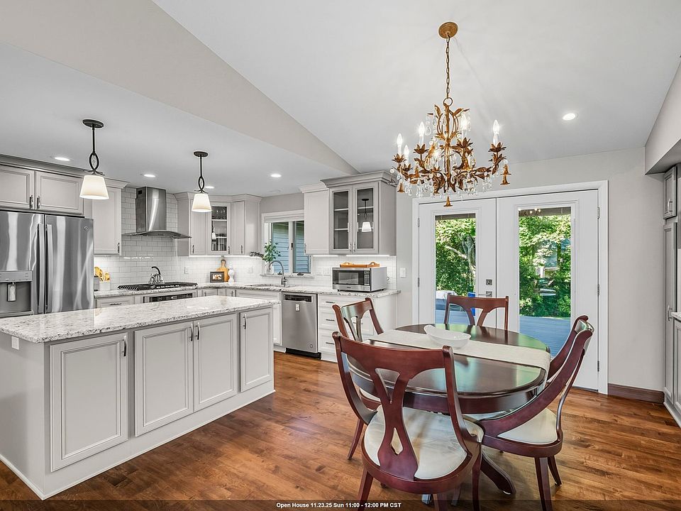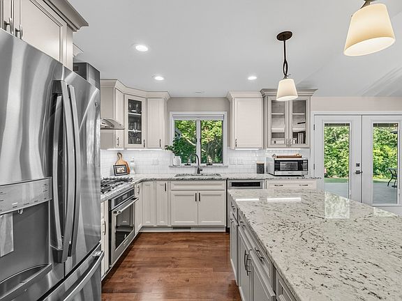 Enjoy a nature-surrounded retreat with privacy on this wooded acre lot with a creek, bridge and a sledding hill! Executive 3 Bedroom, 2.5 Bath ranch with 3 car epoxy garage less than five minutes from shopping, dining, and the airport. Kitchen by Green Bay Builders has custom soft-close cabinets, granite counters, island, coffee bar, and pantry and patio doors that lead outside to the 30x20 maintenance free deck! Living room with floor-to-ceiling fireplace and maple floors by Ralph’s Hardwood. Sunroom features a cathedral ceiling, oversized windows with cellular shades, gas fireplace, and coffee bar. Primary bedroom addition is 24x22 with outdoor access, ensuite with tiled walk-in shower, dual vanities, quartz counters, built-in linens, walk-in closet with island and chandelier.