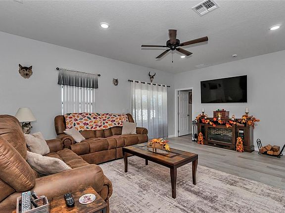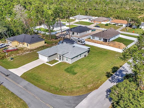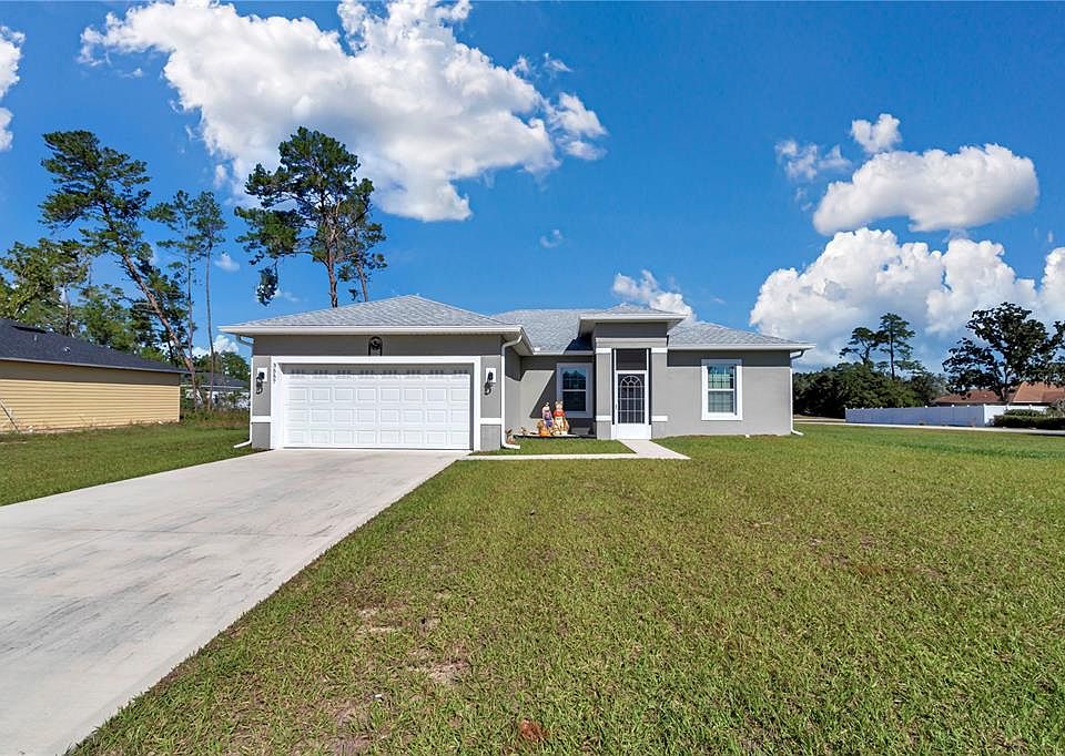 Welcome to this like-new 2023 single-family home on an oversized CORNER LOT in a desirable and growing area of Marion Oaks! This beautifully maintained 4-bedroom, 2-bath home offers 1,782 square feet of open-concept living space and features a split-bedroom floor plan designed for comfort and functionality. Step inside to find luxury vinyl plank flooring throughout, soft-close cabinetry and granite countertops in the kitchen and bathrooms. The kitchen is spacious with stainless steel appliances, large island & closet pantry. The spacious great room opens to a brand-new 12x28 SCREENED IN LANAI, perfect for relaxing or entertaining. The primary bedroom suite features TWO LARGE WALK-IN CLOSETS, double sink vanity, large shower and a luxury soaking tub for a SPA-LIKE retreat in the attached ensuite bathroom. Three more spacious bedrooms for guests, an office or whatever your needs are. Plenty of room here, along with a guest bathroom. Recent upgrades set this home apart from new construction—including rain gutters, a whole-house water softener, 12x28 screened in lanai and a 12x24 storage shed with ramp. Lots of space to store your equipment and/or toys. The oversized corner lot (.32 acre) provides ample space for your RV, boat, or trailer. The owner even has an exterior heavy duty outlet ready for a portable generator or RV hookup. Enjoy peace of mind in a well-kept neighborhood surrounded by newer homes on larger lots—just minutes to schools, shopping, dining, and I-75. Why wait to build or buy new when you can own this move-in-ready home with all the extras already done and sitting on a great oversized corner lot? Make an appointment to tour this lovely property today!