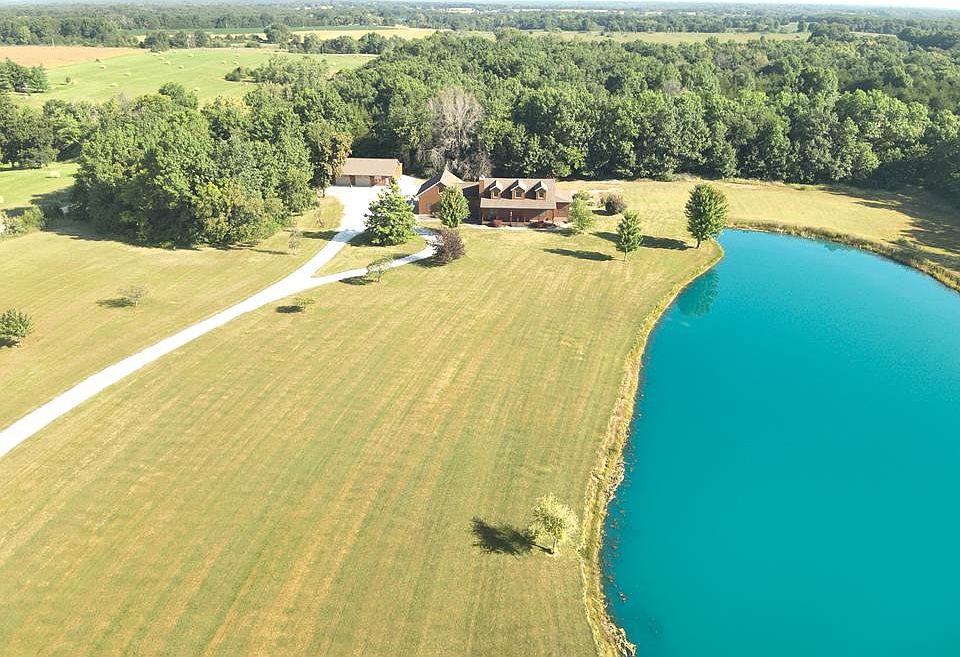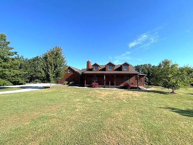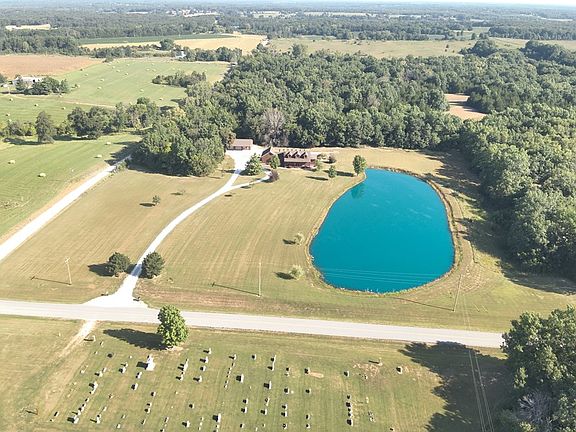 Custom lodge-style home on 8.4 acres with a 2-acre stocked pond. Features Amish-milled wood siding, vaulted ceilings, quartersawn cabinets, butcher block countertops, and rock fireplaces. Finished basement includes extra living space, kitchenette, 2 bedrooms, and a bath. Heated/cooled 32x28 garage and 48x30 shop with bath and kitchenette. Recent updates: TruLog metal siding, composite decks, and high-impact roof. Easy access to Macon and Moberly.