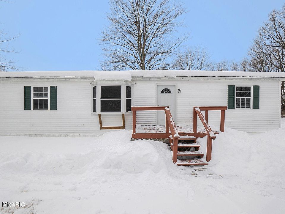 This Mattawan Schools updated manufactured home sits on a wooded acre lot that includes a 24x40 Morton pole barn, a multi-level deck and lots of parking. Inside you'll enjoy the updated eat in Kitchen with new stainless dishwasher, gas range, side-by-side refrigerator and painted cabinetry. A spacious living room with a gas fireplace, 2 nice size bedrooms, a large full bathroom, and central air. Updates include newer roofing on the house, replacement windows, furnace, 4'' well, painted cabinets, flooring, appliances and painting through out. Tax records reflect Paw Paw Schools, however, the home is located in Mattawan School district - Please verify with Mattawan. Cash only-no tags for financing. Measurements provided by county website and should be verified.