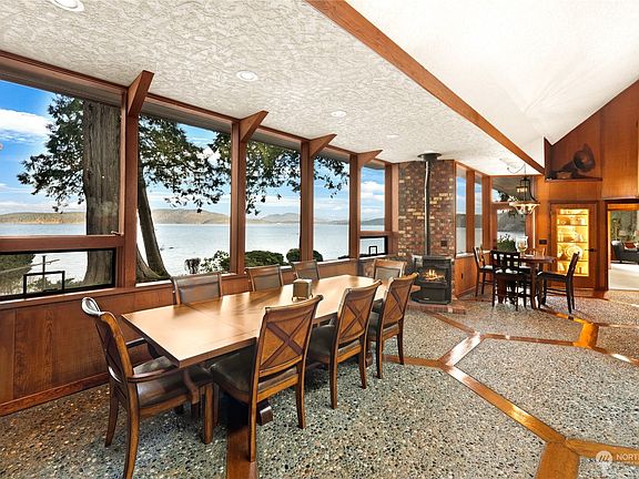 Exquisite Frank Lloyd Wright inspired architectural masterpiece! Serenely nestled on 2-acres, park-like waterfront setting. Enjoy spectacular, expansive water views & stunning sunsets from every room w/360-degree walls of windows. This open concept show piece is designed to incorporate natural materials, local stone, wood, soothing earth tones & copper countertops. Lush, landscaped gardens, pathways & patios provide sun or shade. Beautiful, unobstructive views of San Juan Islands & Burrows Bay. Breathtaking main level living, with panel skylights allowing natural light to enhance the living space. 5-car garage/shop. Unwind in a one-of-a-kind, tranquil waterfront oasis. Access to private community dock & beaches. 2 parcels, room to build.