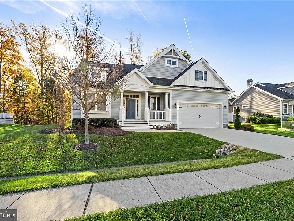 Welcome to this absolutely charming Kingfisher — one of Schell’s most beloved floor plans — offering a comfortable, welcoming feel the moment you arrive. Set on a premium pond-front lot in the gated community of Sawgrass at White Oak Creek, this home brings together thoughtful design, inviting living spaces, and peaceful views both front and back. From the front porch, a view of the tranquil pond and fountain anchors the home within its peaceful, wooded surroundings. Inside, warm wood flooring extends across the main level and up through the second floor, lending a consistent, welcoming character to every space. A convenient coat closet sits just off the entry, and to the left, a set of French doors opens to a first-floor study. With a half bath nearby and positioned away from the main living areas, this space works beautifully for work-from-home needs or as a quiet, private option for guests. The heart of the home is the two-story great room, filled with natural light from transom windows and vaulted ceilings. The kitchen serves as the gathering hub with white cabinetry, quartz countertops, a farmhouse sink, cooktop and wall oven, and a central island with seating. A pantry off the back hallway adds extra storage, and the easy flow from kitchen to dining to great room keeps everyday living simple and social. The main-level bedroom offers a calming retreat with a tray ceiling, a striking Palladian window with a barrel vault, a walk-in closet, and a beautifully tiled bath. Upstairs, two well-sized guest rooms share a full bath, and the open loft overlooks the great room below. The finished space over the garage provides additional flexibility, complete with its own full bath and a dedicated mini-split system — perfect for guests, hobbies, or work space. A French door leads from the dining area to the screened-in porch, where a ceiling fan and wooded backdrop create a relaxing spot for morning coffee or evening conversations. With the pond in front and protected woodland behind, the home offers both scenery and privacy — rare to find together this close to the beach areas. The mud room/laundry room sits just off the two-car garage for convenience, and plantation shutters throughout the home bring a classic, clean look along with practical light control. Sawgrass residents enjoy access to two community clubhouses with pools, fitness centers, tennis, pickleball, basketball, and bocce — all within a secure, gated setting. Located just off Old Landing Road, this home offers quick access to Rehoboth Beach, Lewes, restaurants, golf, movies and waterparks, and tax-free shopping. A welcoming atmosphere, smart layout, and location that keeps you close to everything — this beautiful Kingfisher home is ready for its next chapter. Request a private tour today!l