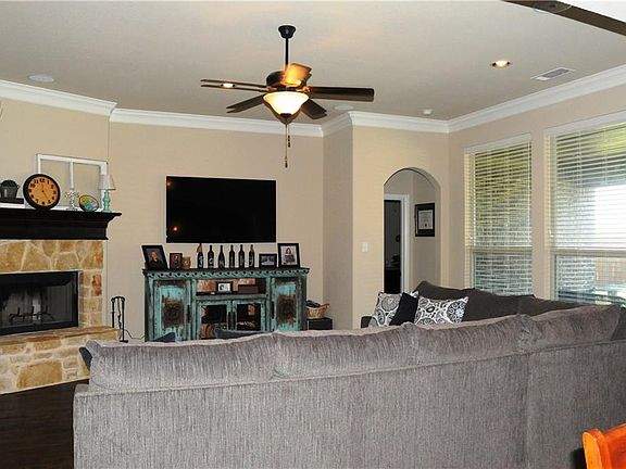 Spacious 4-3-2 home in Shannon Creek, just 25 minutes from downtown Ft. Worth. This 2,702 sq. ft. open concept home offers a super, functional floor plan for a family. Livingroom boasts luxurious hand-scraped hardwood floors, crown molding and a rustic stone woodburning fireplace. Gourmet kitchen has a propane gas cooktop, electric-convection oven and pantry. Thick granite countertops. Breakfast bar; adjacent dining area. Tile floors in kitchen, dining and bathrooms; carpeted bedrooms. Ceiling fans. Split bedrooms. Private Master bedroom with huge en suite. A full bath serves other bedrooms. Upstairs game room also has a full bath. Covered patio and privacy fence. Sprinklered lawn. 130-gal. propane tank.