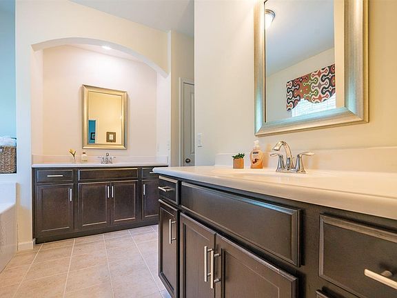 Upstairs, the large primary suite, dual vanities, a soaking tub, and a separate shower. Two additional bedrooms and a loft area.