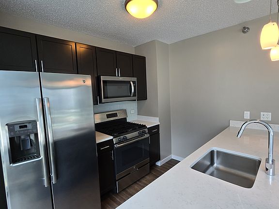 Modern kitchen with stainless steel appliances & quartz countertops