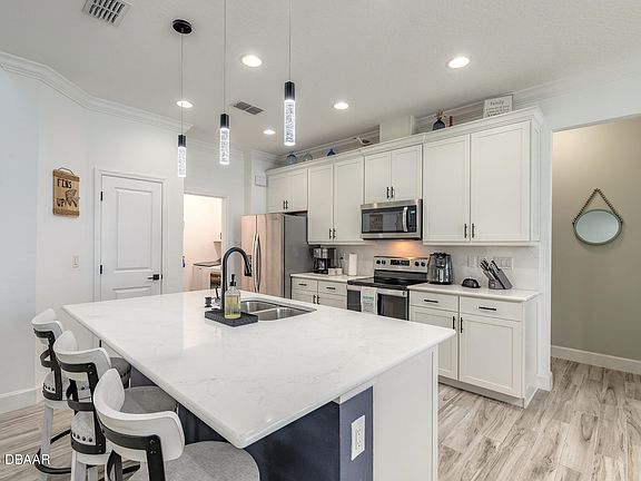BRING ALL OFFERS! Welcome to your DREAMSICLE cottage in Latitude Margaritaville, Daytona Beach's premier 55+ community. Step inside to a bright, open-concept living room that flows seamlessly into the spacious kitchen — ideal for both everyday living and entertaining. The kitchen features 42'' cabinets, quartz countertops, tile backsplash, soft-close drawers, stainless steel appliances, upgraded light fixtures, a double trash pull-out, and an oversized island with plenty of seating space. All seamlessly connected to the light and bright dining area. Just off the living area, the primary bedroom offers a private retreat with an en-suite bathroom featuring granite countertops, double sinks, and a sleek, fully tiled walk-in shower with glass doors. The generous walk-in closet with custom built-ins offers tons of storage. The split layout ensures comfort, privacy, and convenience. Host guests and family alike in a second well-appointed bedroom and a full bathroom with granite countertops and fully tilE shower/tub combo. Set up your home office or gym in the versatile flex room. An easy access laundry room give the home flow and functionality. The tile floors run throughout the home giving it a seamless look while remaining easy to maintain.