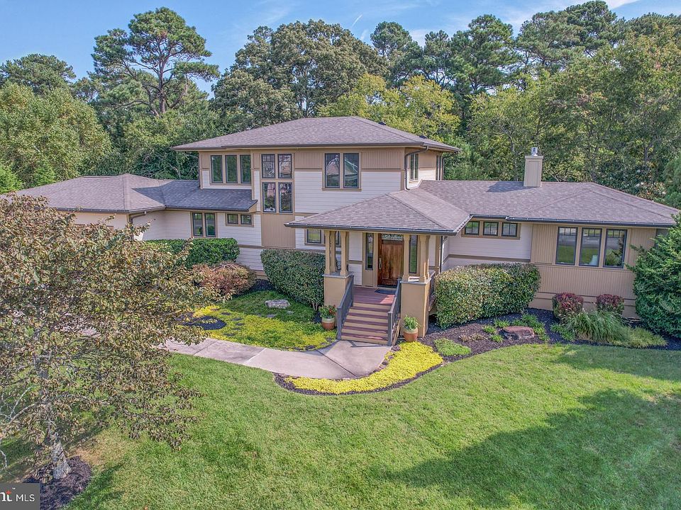 Welcome to 35602 Peregrine Drive! This Prairie-style Craftsman home is situated on over a half-acre, premium perimeter lot with private stepping-stone access to the Junction & Breakwater Trail. With 3,200+/- square feet of living space, this distinctive home was crafted with absolute attention to detail, energy efficiency, and custom finishes at every turn. Created by Frank Lloyd Wright, the Prairie style emphasizes the flow of space throughout the home from inside to outside. Uninterrupted glass windows offer a picturesque view of the outdoors from all sides. Upon entry into the foyer, one is welcomed by warm, reclaimed hardwood flooring which spans throughout the entire dwelling. The living and dining areas are anchored by a two-sided gas fireplace and flow onto a large 17’ x 13’ outdoor composite deck. The kitchen features a gas range, two dishwashers, a large island, deep pantry, and custom cabinetry. Across the way is the study, offering built-in desk and counter space at varying heights as well as custom shelving. For privacy, just pull the frosted-glass pocket door to create a quieter environment. The first-level primary bedroom features custom bookcases, two walk-in closets, and an en suite bathroom complete with soaking tub, steamed tiled shower, and dual vanities. The downstairs laundry room includes a top-of-the-line Maytag washer and dryer set. The mud room area offers custom shelving space and leads out to the three-car garage with even more storage options. There is an additional full bathroom on the main level. After climbing the custom staircase, which was built on site, the upper level features a second primary bedroom with attached full bathroom, two guest bedrooms, second living area or bedroom, and additional laundry hook up. The green and energy-efficient considerations of this home are vast and include 2” x 6” construction, solar panels, energy recovery ventilators on both levels, and a conditioned crawlspace and attic. The backyard is a separate oasis and offers lush landscaping, a patio and deck, irrigation system, vegetable garden, two gas lines for a BBQ grill, outdoor shower, and a crafted stone pathway leading to the bike trail. What’s more, the highly coveted Hawkseye community features a community pool and is just a short bike ride to downtown Lewes.